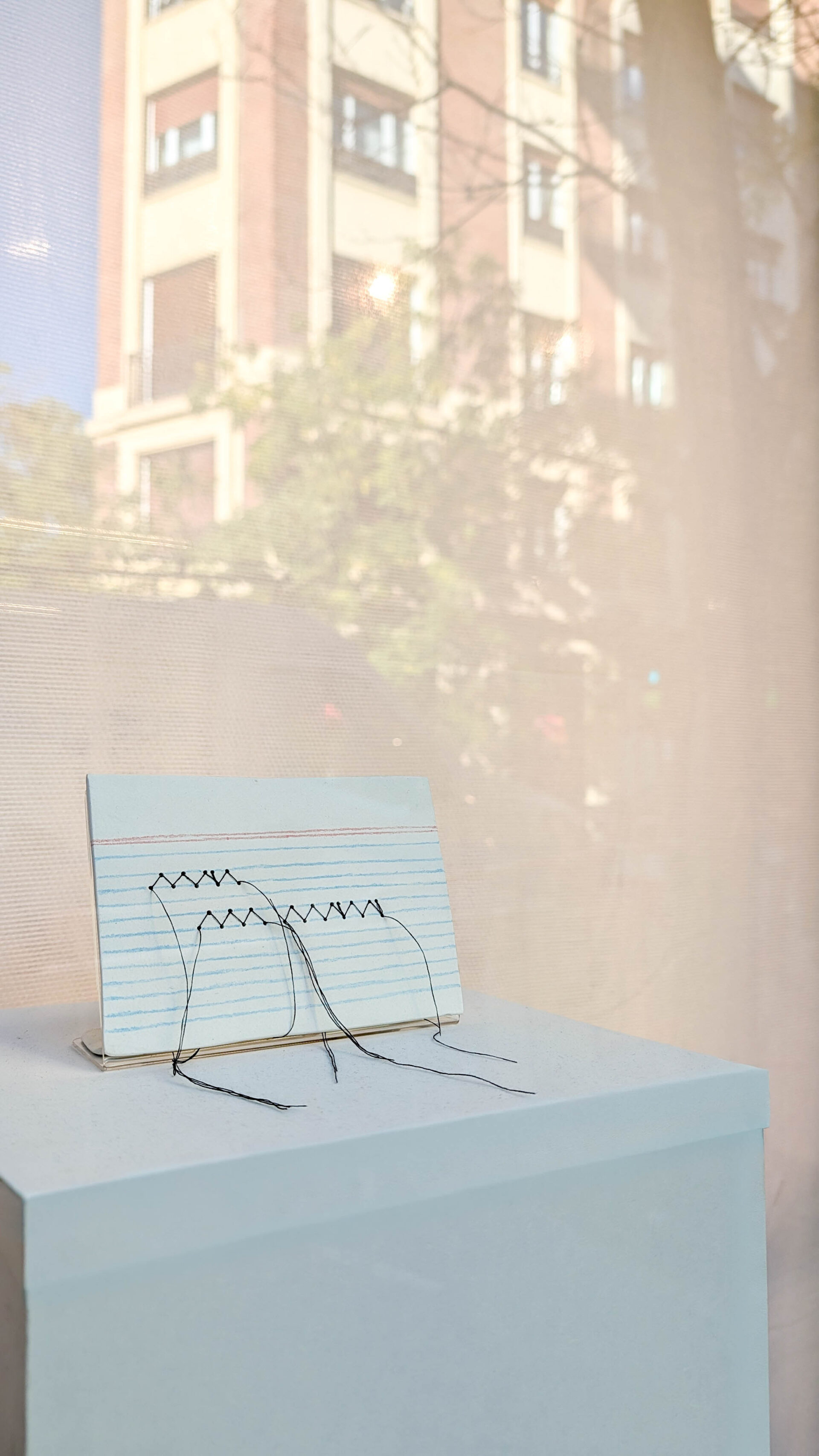 La artista argentina recoge ese legado de carácter rizomático y lo reinterpreta a través de tres piezas que dialogan con el universo de Moliner. Una ficha de cerámica erigida sobre un pedestal se convierte en piedra fundacional, memoria tangible de cada palabra pero también símbolo o condensación de la materialidad y permanencia del lenguaje. Una cortina compuesta por 225 fichas intervenidas con costura teje un umbral sensible entre lo doméstico y lo intelectual, evocando el trabajo callado de la lexicógrafa así como la persistencia de una labor sostenida en el tiempo. Se trata de un tejido poroso en el que cada unidad se enlaza con otras sin centro ni jerarquía. El número de fichas no es casual: a María Moliner le llevó quince años dar forma a su Diccionario de uso del español, y el estor, como un guiño, se organiza en una grilla de quince filas por quince columnas. Finalmente, un collage textil representa a María Moliner sentada en su mesa, devolviéndonos su figura en la intimidad de la creación y encarnando la labor infinita que la sostuvo.