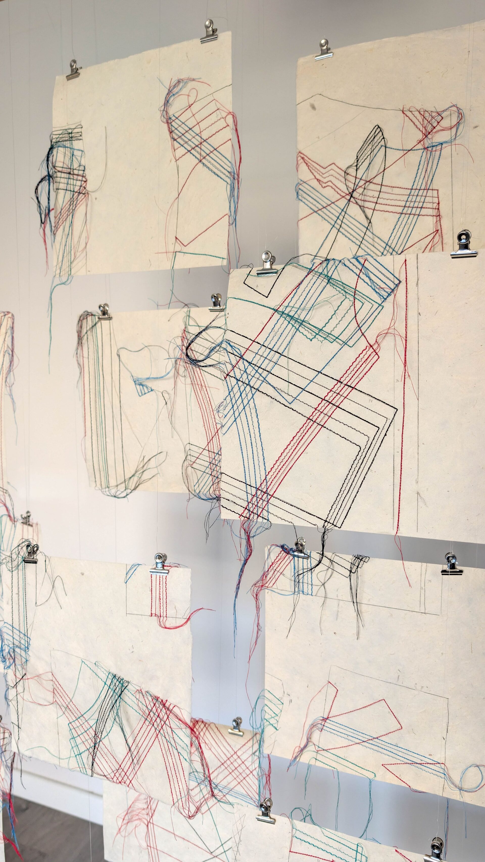 La obra consta de 15 piezas de 25 x 25 cm de papel lokta sobre las que se dibujaron matrices de indumentaria a la medida del cuerpo de la artista. ¿Matrices a la medida de un cuerpo? o ¿un cuerpo a la medida de matrices?. Puntada tras puntada se conforman las diferentes líneas de una cartografía corporal.
