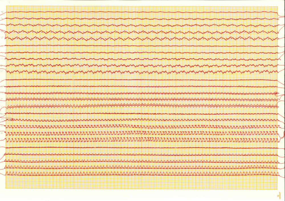 Del proceso resultaron unas primeras 6 hojas milimetradas A3, donde se desplegó el dibujo de las 30 puntadas. Luego, se pasó a cartografiar cada puntada por separado para poder analizar sus coordenadas y de esta manera sonificarlas.